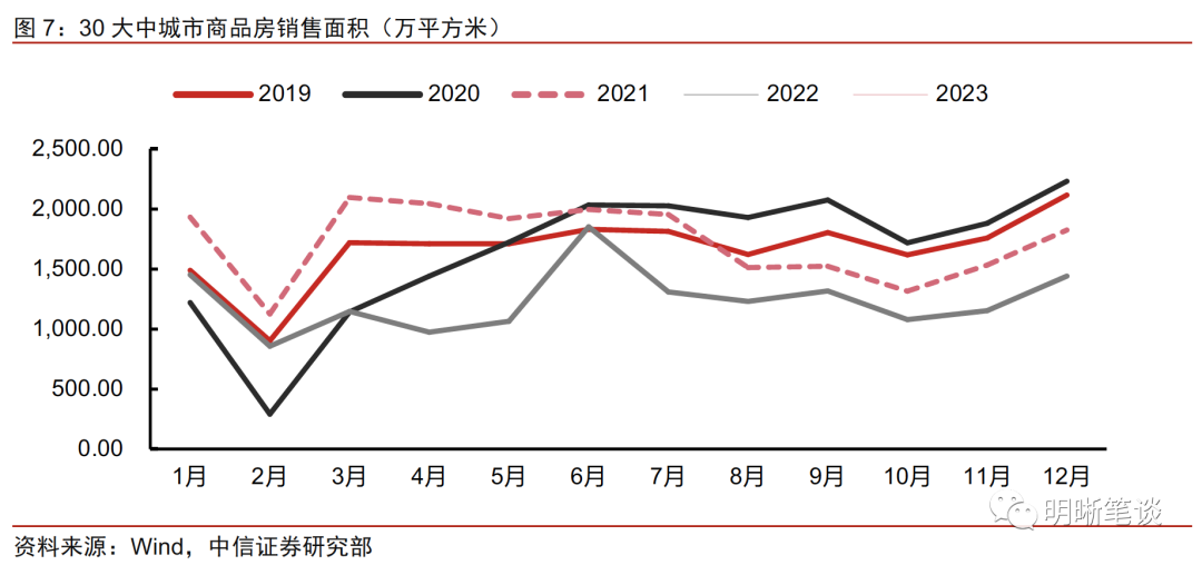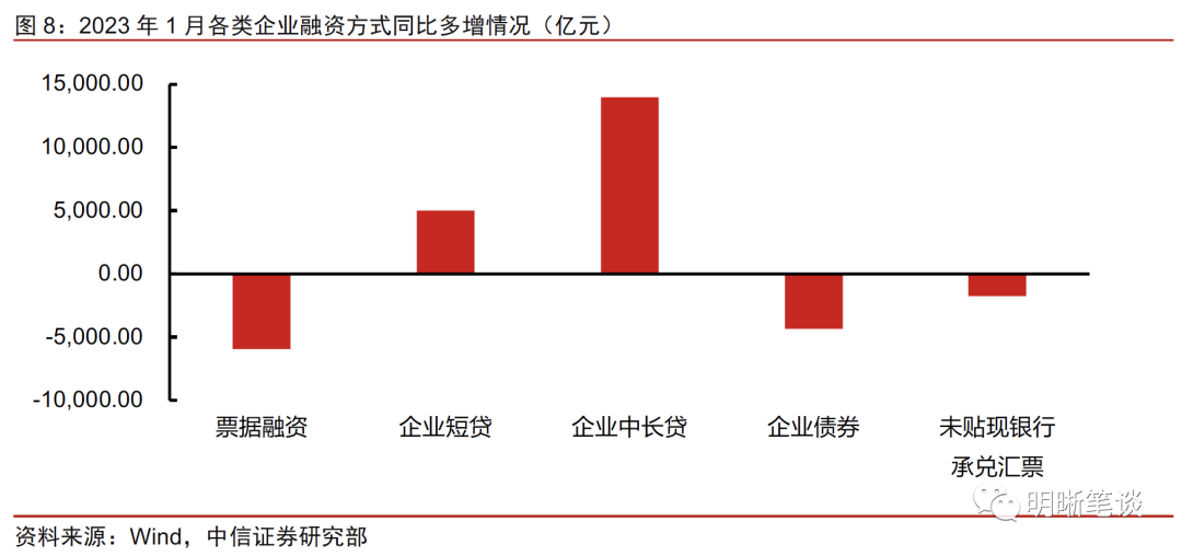 信贷总量较好,但分结构来看,住户部门的问题一直存在且迟迟未见改善,短期内住户部门依然会成为压制信贷修复的一大因素。考虑到按揭贷款本身还会滞后于房地产销售数据,因此居民中长贷的拖累可能会持续一段时间。1月住户贷款同比少增5858亿元,其中中长期贷款同比少增5193亿元。从2022年以来,居民购房加杠杆意愿一直表现较弱,虽然政策已经通过“保交楼”专项借款、下调住房公积金贷款利率以及建立首套住房贷款利率政策动态调整机制等方式从需求端予以支持,但是效果仍待观察。考虑到住房按揭贷款本身就会滞后于销售数据,因此居民中长贷的反弹可能还须等待至一季度以后。