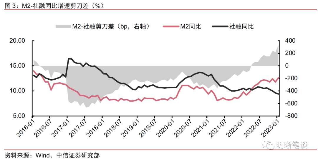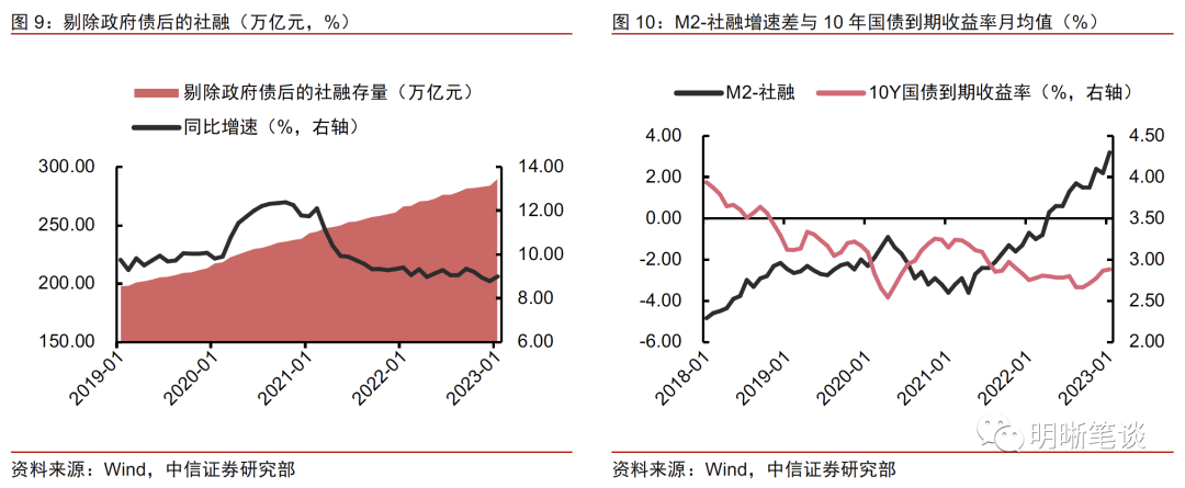 即便剔除政府债因素影响,社融同比增速依然没有回升至2022年中水平,M2-社融剪刀差扩大也从侧面验证利率仍有下行空间。