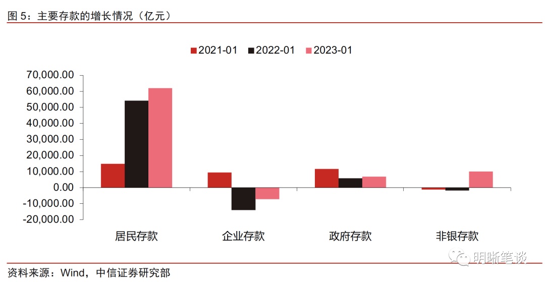 1月住户存款同比多增近8000亿元,结合2022年的经验来看,这反映出“超额储蓄”现象仍存,在资产价值与收入水平的不确定性较大的情况下,居民倾向于更多的储蓄,此外,居民部门的购房意愿降低也会导致潜在的购房配置资金向储蓄转移;而企业存款同比多增与企业贷款高增有关,贷款资金在投入生产前会以存款形式停留在账户上。