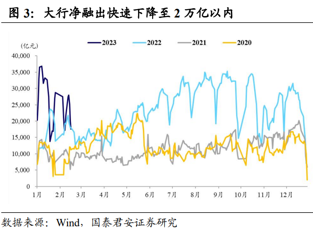 春节以后,大行净融出一直在3万亿以下,从2022年中开始我们一直强调“大行净融出能否达到3万亿是资金面宽松与否的分水岭”,而且过去一周(2月13日到2月17日)大行净融出金额逐步下行到1.66万亿,大行净融出缩量直接造成银行间流动性收紧。