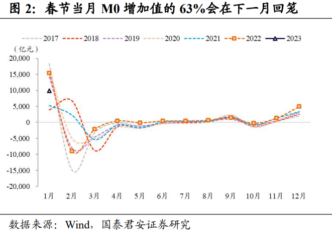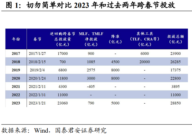 第一点,疫情防控优化后,2023年春节返乡带动的取现需求远大于提倡“就地过年”的21年和22年,参考2020年,我们预计2023年现金耗损或在1.8万亿以上,春节假期前缴税规模参考往年1月份水平或在5000亿元附近,因此央行跨春节逆回购投放量2.3万亿只能维持资金面的供求平衡。虽然数额上远高于过去两年,但不能简单通过逆回购投放总额环比大幅多增来判断央行对狭义流动性的呵护程度,同时采用逆回购而不是比照2020年部分采用TMLF来投放期限相对较长的投放工具也表明低于预期。