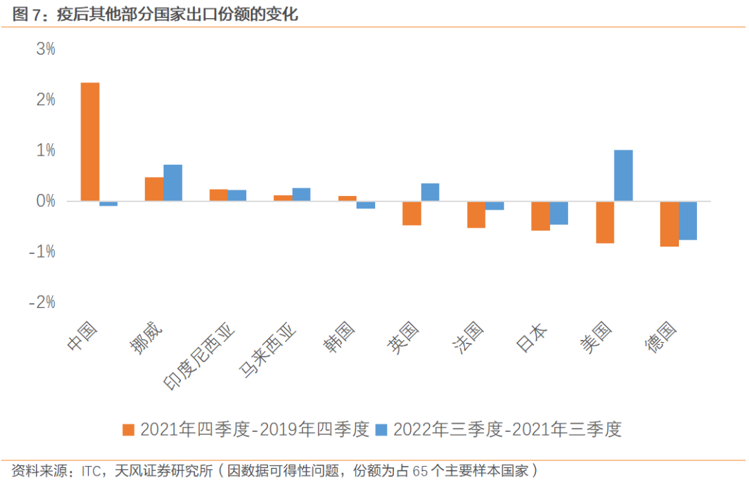 除了外需,出口也受到份额的影响。过去三年,中国出口份额明显上行并保持高位,2022年前三季度即使受油价和疫情影响,ITC口径出口份额也仅回落了0.1个百分点(大宗商品价格上涨利好上游国家份额提升)。市场对今年出口份额下滑的担忧,实际上都不足为虑。