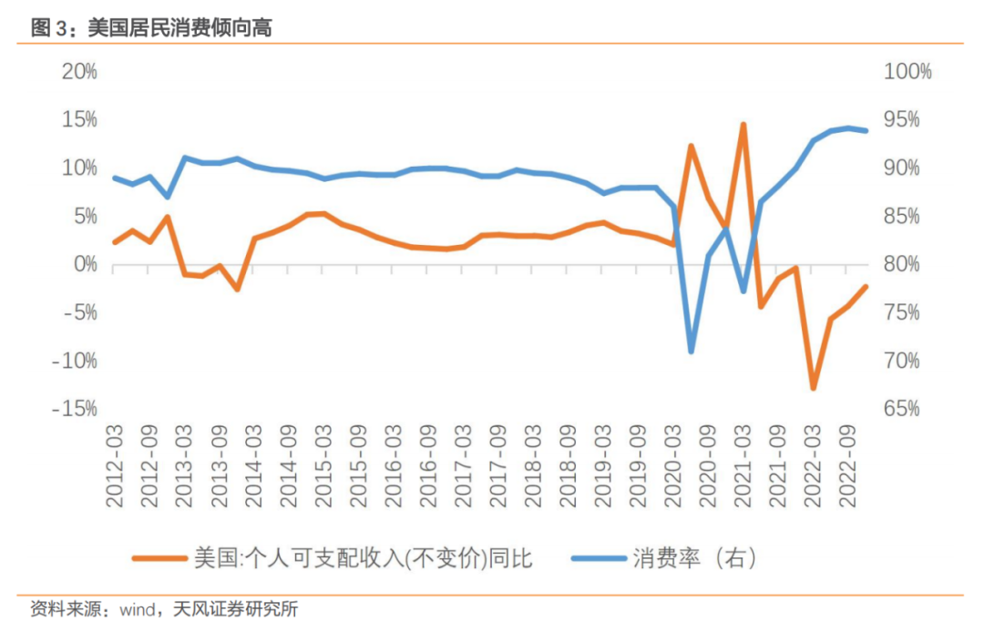 在低失业率、高工资增长的背景下,美国居民更敢花钱。虽然高通胀导致美国居民实际收入在2022年初出现负增,但2020年-2021年积攒的超额储蓄保障了居民消费的韧性,2022年居民消费支出不变价同比增长2.8%。同时,2022年末居民消费率(实际消费支出/实际可支配收入)达93.9%2,高于2019年末5.96个百分点(见图3)。后续随着通胀压力进一步缓解,美国居民消费有望维持韧性。