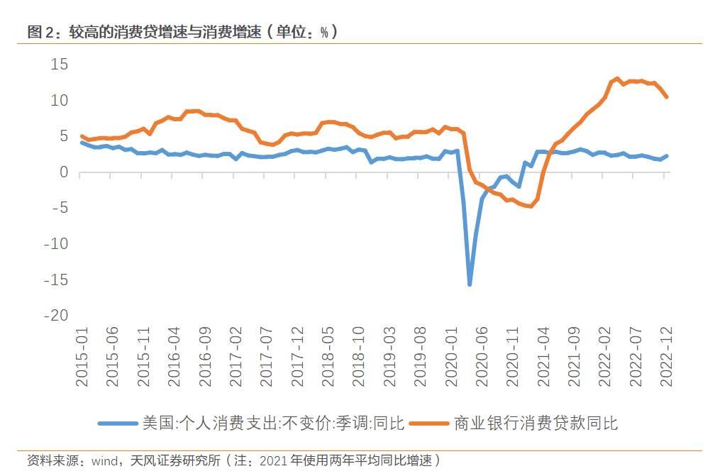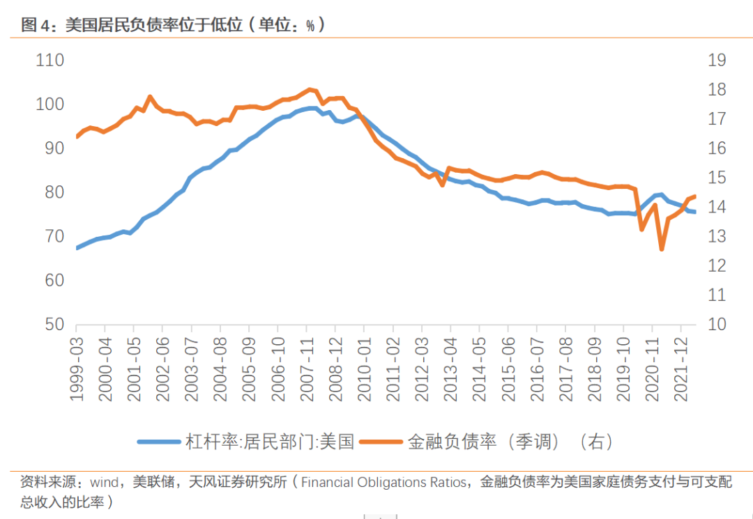 同时,美国居民的资产负债表依旧健康,2022年二季度美国居民部门杠杆率为75.6%,相比于2019年末仅上升0.3个百分点,家庭金融负债率为14.36%,回落0.33个百分点(见图4)。健康的负债率保证了居民的借贷能力,尽管美联储在2022年快速加息,但截至2022年末美国商业银行的消费贷款同比增速依然在10%以上,远高于疫情前5年5.9%的均值增速(见图2)。