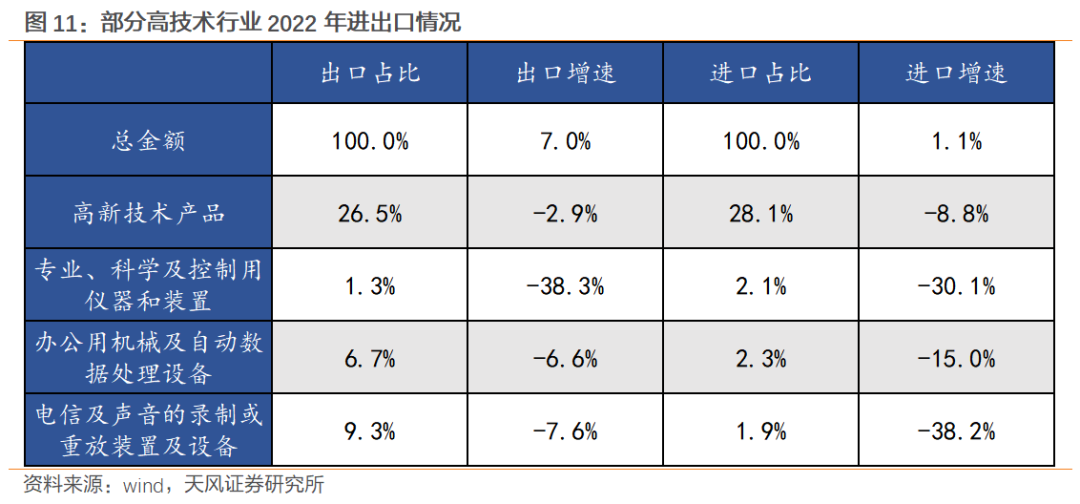 另一个担忧是国际政治格局变化,导致供应链整体外迁。这一因素相比于过去三年并没有改变,一部分高技术行业出于安全考虑,减少在中国投资或增加海外设厂,比如中国的芯片半导体和专业科学仪器在2022年出口增速低于整体水平(见图11)。