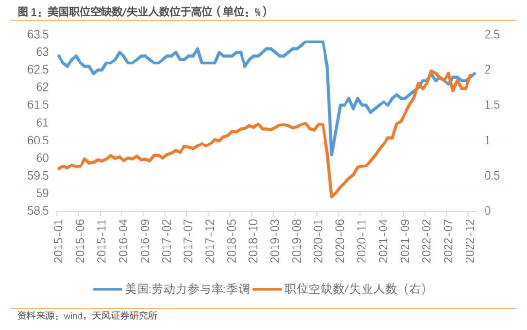 从收入的角度看,不需要担心美国居民当前的消费意愿和能力,因为供不应求的劳动力市场保证了美国居民的工资增长和消费安全感。截止2022年末,职位空缺数比失业人数为1.9,远高于过去5年1.2的平均水平(见图1)。同时,居民工资增速达到3.6%,处于81%的历史分位数水平1。