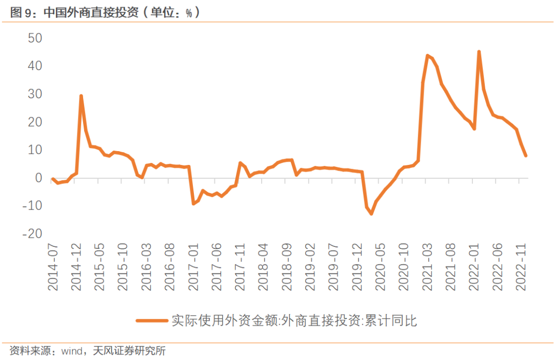 但在效率优先的行业里,中国依然是份额的受益者。原因是在地缘冲突、能源体系和供应链重构的状态下,产业链的稳定性和完备性是和生产运营成本同等重要的优势,体现在数据上是2022年外商对华直接投资额同比增长了8%,高于疫情前五年同比均值4%。2023年,地缘政治冲突和国际秩序重构还在继续,中国在效率优先行业还有可能获得额外的出口份额增长。