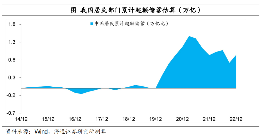 如果参考美联储的测算方法,到2022年底,我国居民部门在疫情三年间累计的超额储蓄或仅有9000多亿元,主要是2020年全年和2021年一季度居民在积累超额储蓄,而其他多数时候,居民收入下降速度更快,反而是在消耗储蓄。按照9000多亿超额储蓄计算,实际只能带动约1.5%的整体消费增长。