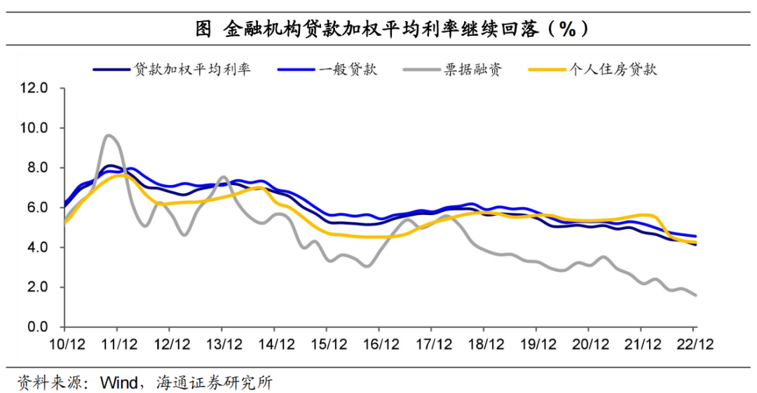 截至去年底,新发放的房贷利率已经与5年LPR利率倒挂。央行公布12月金融机构贷款加权平均利率4.14%,较9月继续下行20bp,创历史以来的新低。其中一般贷款利率下降8bp至4.57%,票据融资利率下降32bp至1.60%。12月个人住房贷款利率环比9月继续回落8bp至4.26%,已经降至当前5年期LPR利率(4.3%)下方。