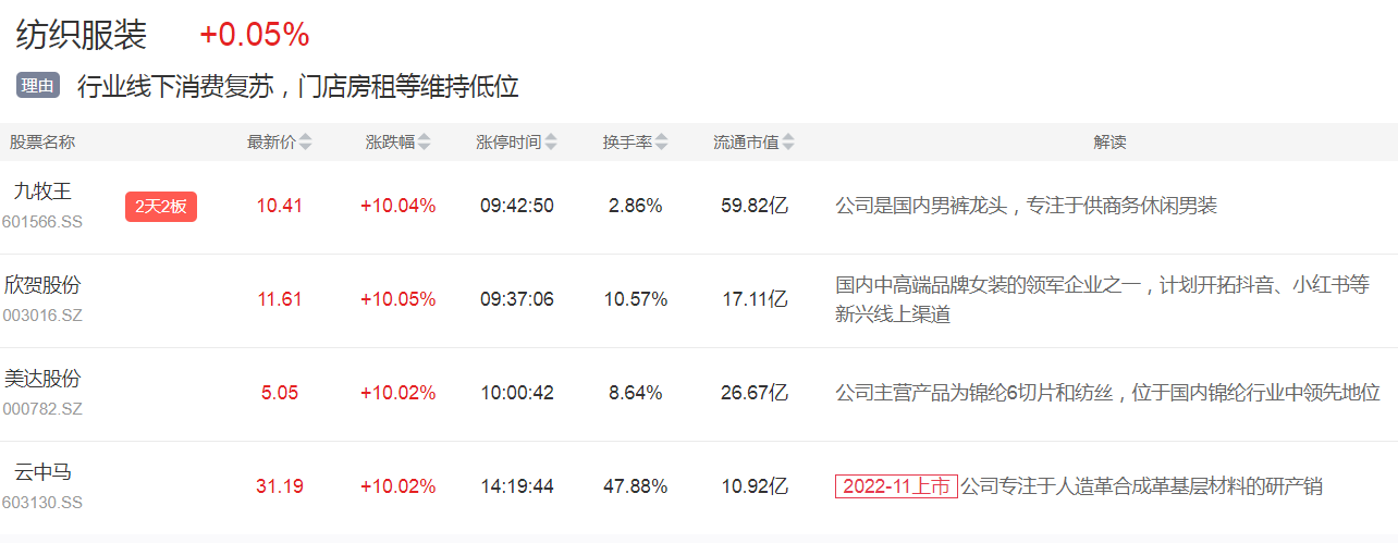 纺织服装板块今日走高,九牧王连板,欣贺股份、美达股份等涨停。