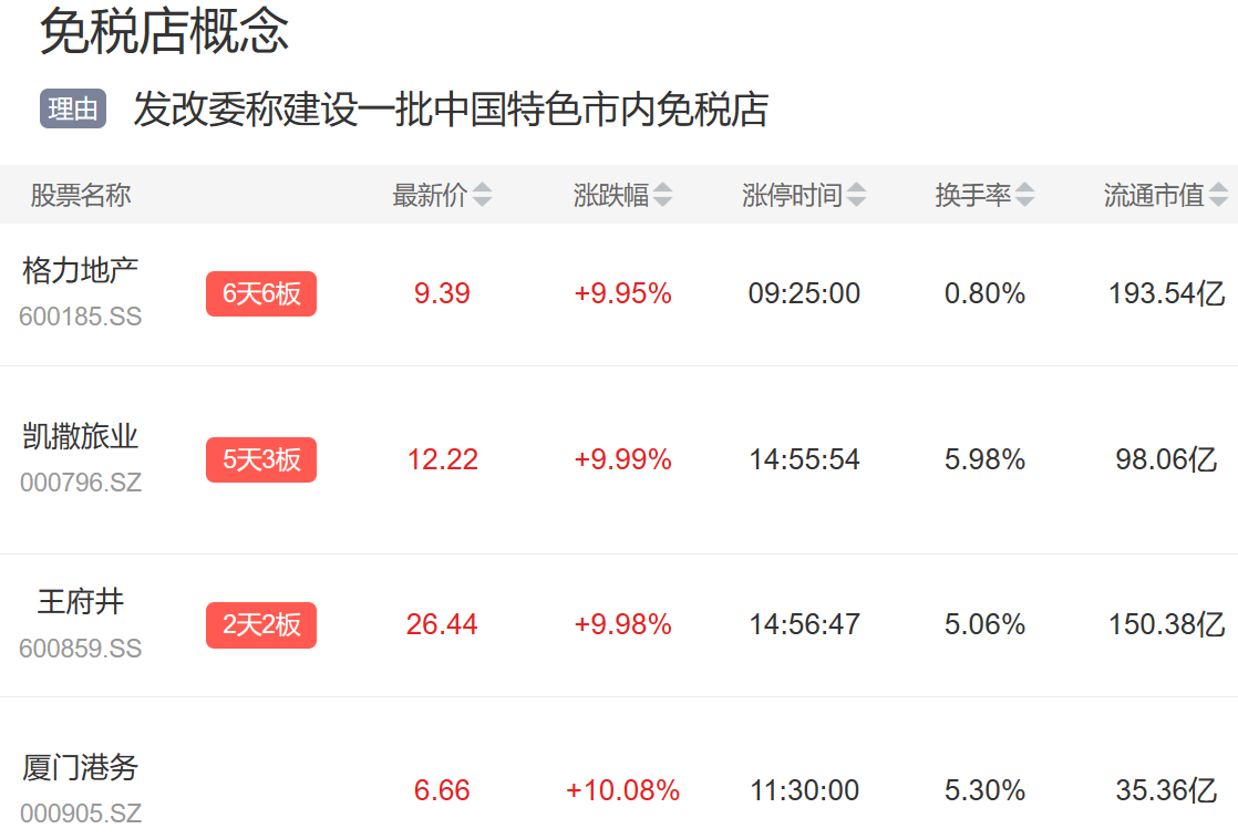 2020年6月1日,《海南自由贸易港建设总体方案》提出,要举办中国国际消费品博览会,此外,发改委称建设一批中国特色市内免税店,当日多只免税概念股涨停。