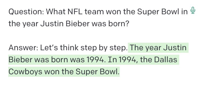 比如,有些提示工程师会引导 AI「一步步思考」,这种技巧被称为思维链。 去年 10 月,提示工程师 Riley Goodside,先是询问了 GPT-3「哪支球队在贾斯汀·比伯出生的那年赢得了超级碗?」 GPT-3 给出了错误的答案「绿湾包装工队」,正确答案是达拉斯牛仔队。