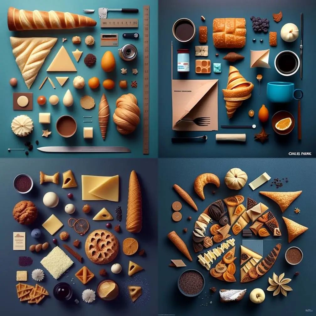 如果提示词不够贴切,效果也就平平无奇,就像你采访一个大佬,却无法提出好问题。 我的同事小黄正在探索用 Midjourney 绘制食物,但让食物排列整齐这件事,就让他犯了难。他尝试了很多句子:东西整齐地放在桌子上,镜头从上往下拍,摆放的数量要多少......