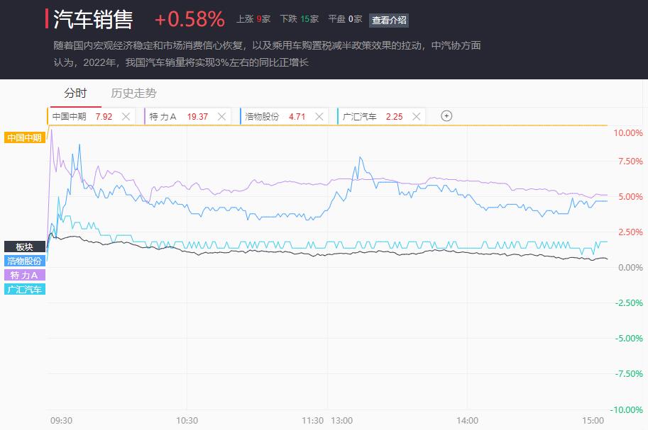 题材方面,汽车销售板块开盘集体发力,中国中期、特力A(炸)先后涨停;浩物股份、广汇汽车、上海物贸、庞大集团均一度大幅走强;