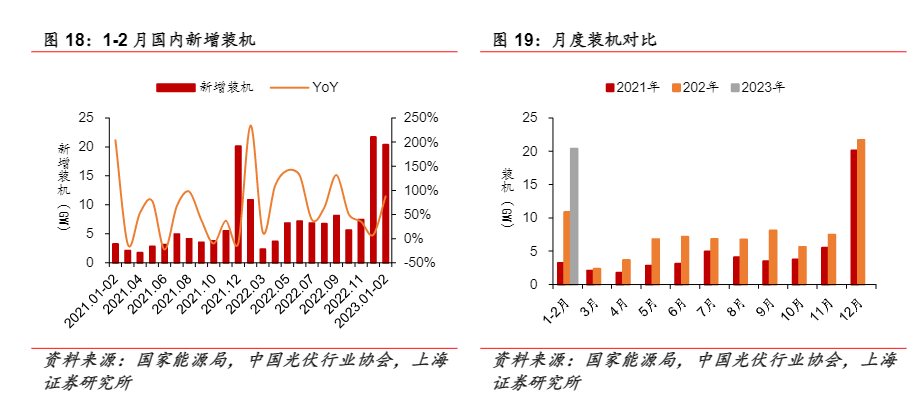 据能源局数据显示,1-2月国内新增光伏装机20.37GW,为历史最高,且同比增长87.57%。