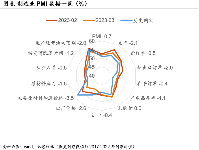 从今日公布的PMI数据来看,节后制造业环比强脉冲的修复速度放缓,3月的制造业PMI指数从2月高点的52.6%降至51.9%。