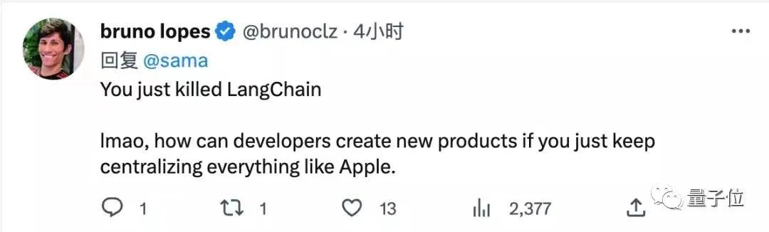 比如OpenAI对ChatGPT代码解释器的推出,就杀死了一个刚刚获得1000万美元种子轮融资的公司LangChain,它的创业思路是利用语言模型APi快速构建应用程序的Python框架。