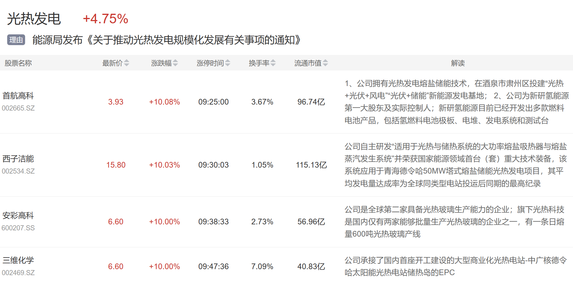 光热发电板块今日爆发,首航高科、西子节能、安彩高科等相继涨停。