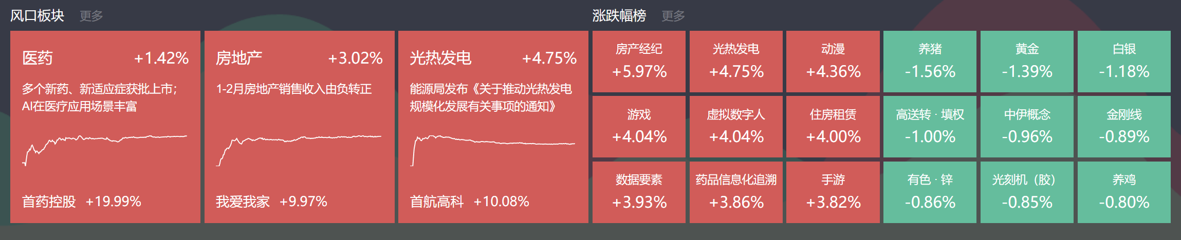 沪指延续反弹反弹走势,创业板指盘中涨超1%。以创新药为首的医药医疗板块全线爆发,首药控股20CM涨停,奥赛康[002755.SZ、300361.SZ]、海思科封板,毕得医药、泽璟制药、海创药业、百济神州等十余股涨超10%。房地产板块迎来久违反弹,并带动家居家电股走高,天保基建、中交地产、我爱我家、江山欧派、四通股份等涨停。ChatGPT概念股再度走强,中文在线、朗玛信息20CM涨停,神州泰岳、浩瀚深度、光云科技、神思电子等涨超10%。个股涨多跌少,两市约3400股飘红,成交连续第四个交易日破万亿。