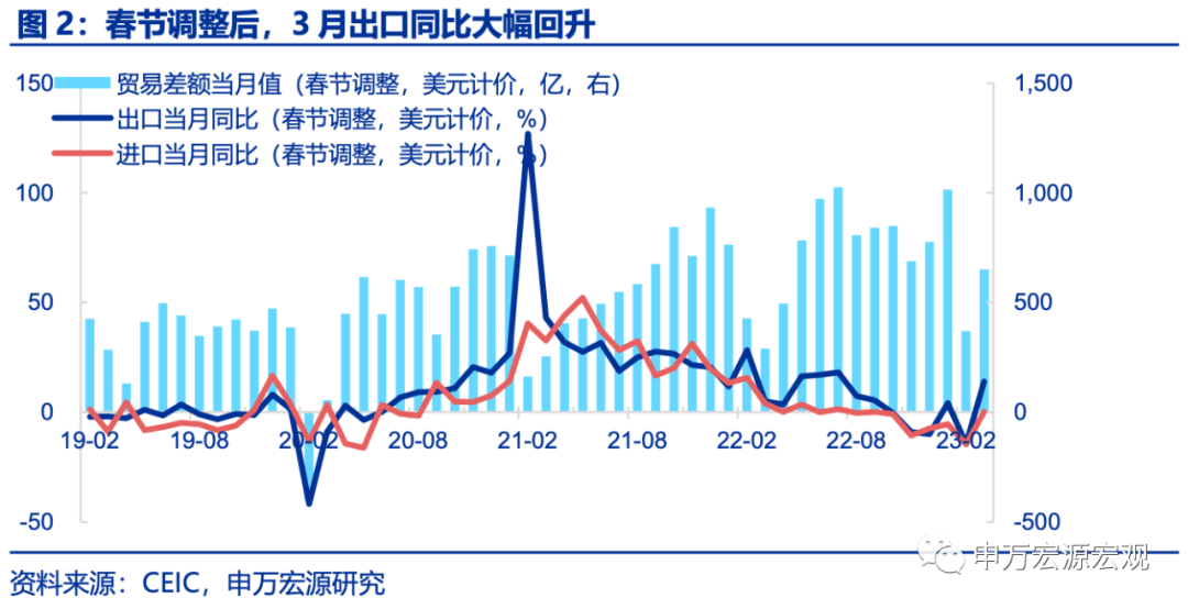 3月出口当月同比(美元计价,下同)为14.8%,与我们此前预期5%~10%的乐观预期方向一致、幅度甚至更强。此前海关也公布了1月、2月出口单月数据,3月出口同比较2月(-1.3%)大幅回升16个百分点,而2月偏高有春节的影响,春节调整后3月较2月实际上大幅回升28.3pct至13.9%,其中18个百分点来自低基数,10个百分点来自生产填补22Q4缺口的支撑。