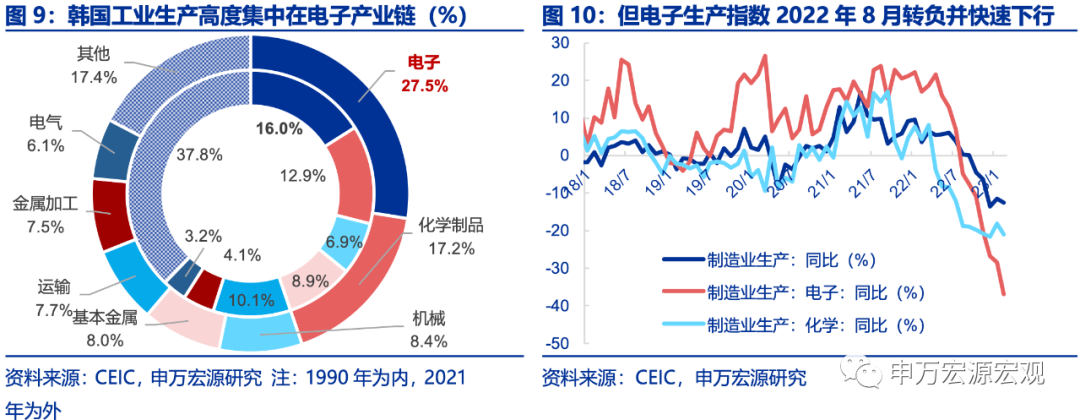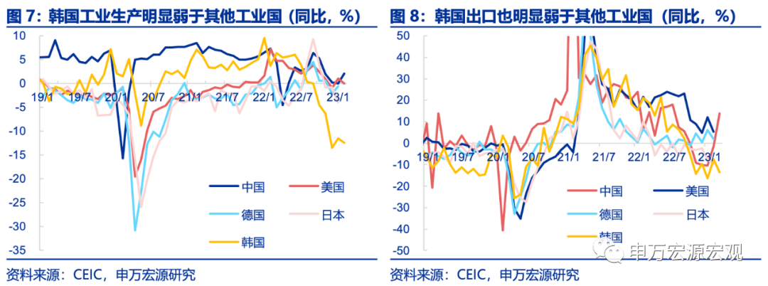 美国半导体法案的“长臂管辖”,令韩国出口已经不再成为出口的领先指标。在总量数据上,韩国工业生产和出口都弱于其他主要工业国,如中美日德的工业生产同比在2023年年初都在0%左右附近,而韩国工业生产下探至-10%以下。韩国出口同样表现最差,23Q1出口同比同样跌至-10%以下,成为主要工业国出口数据中的“垫底”。背后的核心因素在于韩国高度集中于电子产业链,制造业中有超过四分之一都是电子产品的生产,而美国半导体法案的“长臂管辖”令韩国电子生产指数从2022年4月以来持续下行,8月同比转负增,至2023年2月同比已经下滑至-37.0%,拖累韩国工业生产和出口表现,令韩国已经不再成为全球外需的领先指标。