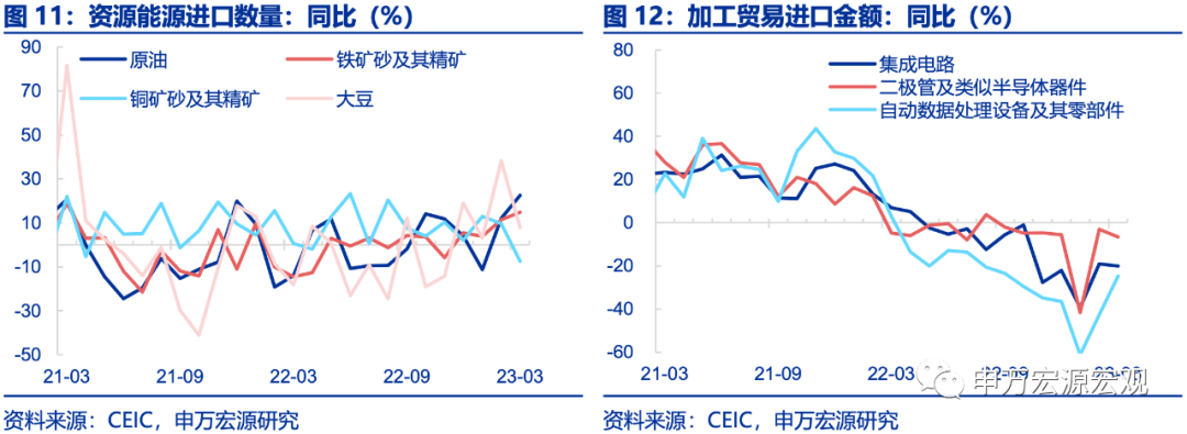 22Q4深度负增的机电产品出口增速,3月单月大幅改善(春节调整后+28.1pct至12.3%,下同),该单项即拉动3月整体出口增速16.7个百分点,其中,家用电器(+38.7pct至11.3%)、集成电路(+19.2pct至-3%)等出口均大幅回升,显示业生产加快恢复并对应推动高附加值商品出口逐步回补前期缺口。