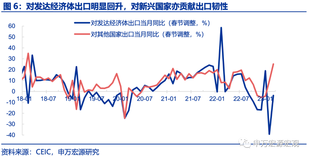 春节调整后3月出口较2月单月大幅回升28个百分点,其中18个百分点来自低基数,10个百分点来自生产填补22Q4缺口形成的支撑。22Q4出口“逆外需”式走弱主因供给冲击,彼时发达经济体核心商品零售增速仍高达6.4%、但我国出口却陷入-10%深度跌幅,相差近16个百分点源于疫情对于国内工业生产的扰动,而今年以来伴随生产恢复填补22Q4缺口,出口也对应大幅反弹。