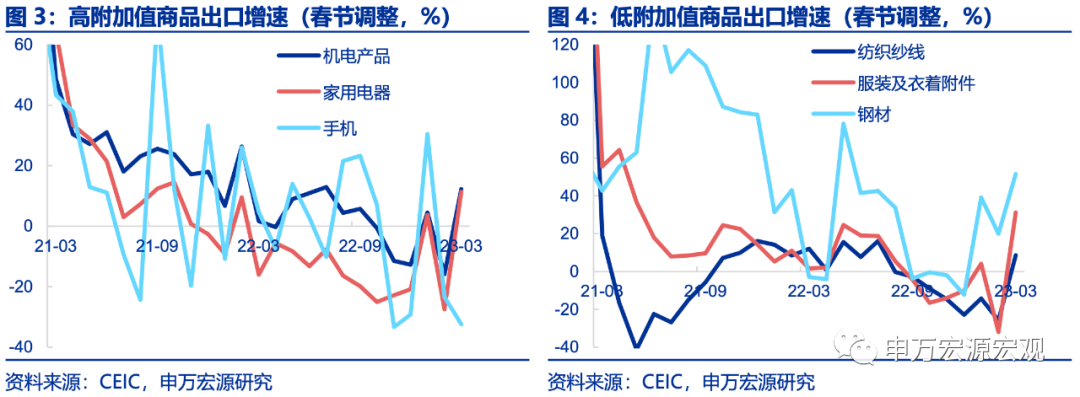 3月支撑整体出口增速明显回升的商品结构中,最主要的贡献来源也恰好是22Q4因供给冲击大幅走弱的领域,22Q4深度负增的机电产品出口增速,3月单月大幅改善(春节调整后+28.1pct至12.3%,下同),该单项即拉动3月整体出口增速(春节调整后)16.7个百分点,其中,家用电器(+38.7pct至11.3%)、集成电路(+19.2pct至-3%)、自动数据处理设备(+11.5pct至-26.5%)出口均大幅回升,显示业生产加快恢复并对应推动高附加值商品出口逐步回补前期缺口。与此同时,在美国居民超额储蓄仍有1.2万亿保障外需短期仍然相对强劲背景下,对外需变动较敏感的低附加值商品出口增速也积极回升,纺织纱线(+34.4pct至8.6%)、服装(+63.3pct至31.2%)也明显回升。
