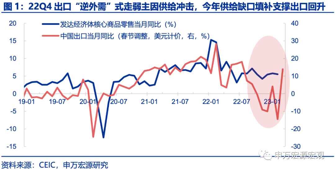 22Q4出口“逆外需”式走弱主因供给冲击,今年供给缺口填补支撑出口回升。22Q4出口大幅走弱并非源于外需大幅降温,彼时发达经济体核心商品零售增速仍高达6.4%、但我国出口却陷入-10%深度跌幅,相差近16个百分点源于疫情对于国内工业生产的扰动,而今年以来伴随生产恢复填补22Q4缺口,出口也对应大幅反弹。