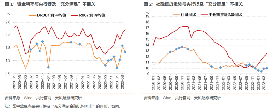 直观来看,央行是否提“充分满足金融机构需求”,与资金利率走势或社融信贷表现并不直接相关。