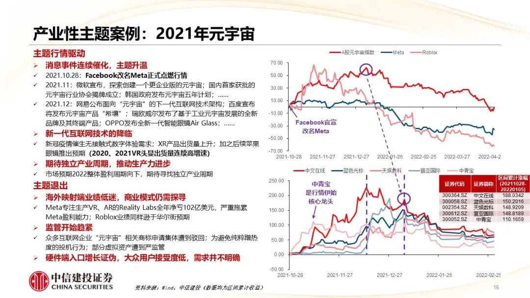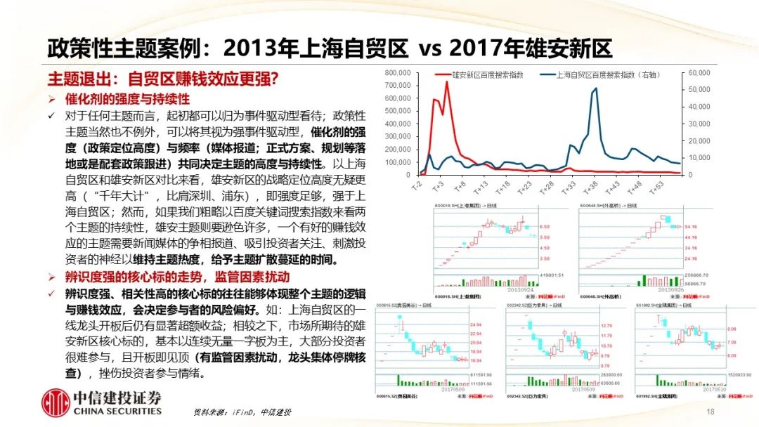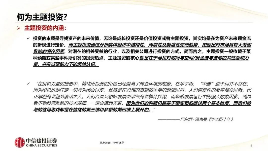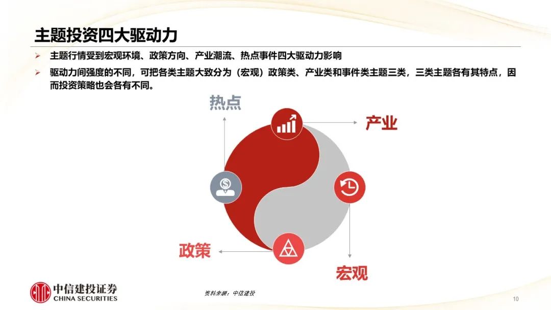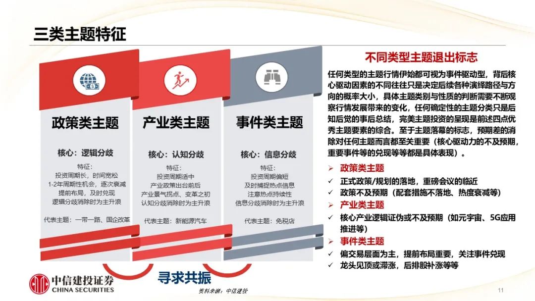 ●核心摘要:近期AI概念热度延续,中特估方向也反复活跃,两大主题表现精彩纷呈,因此本篇周报尝试总结一些主题投资方法论的思考,并在此基础上,针对不同类型的主题投资,简要复盘了过往相应具体案例的驱动因素与退出标志。对于以AI为代表的产业性主题而言,紧跟产业核心逻辑的变化至关重要,中短期维度内主题落幕的标志是预期差的消除,内部轮动的关键在于寻找新的预期差;而更长时间维度内,主题能够得以延续,甚至向成长投资切换的重要前提是产业逻辑的顺畅演绎。(典型的失败案例可以参考2021年末的元宇宙)。而对于以中特估为代表的政策性主题,关注重磅会议、文件规划等的兑现可能是较好的参考标志。