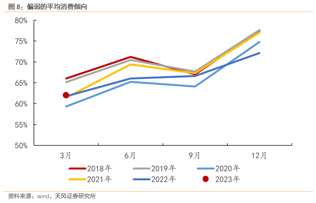 由于没有政策支持,大多数可选消费的修复主要依靠居民收入改善和消费倾向(当季消费支出/当季可支配收入)回升,所以可选消费的复苏是一个慢变量。