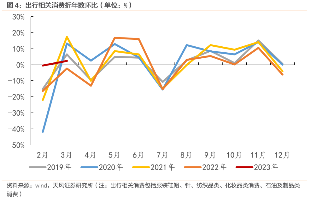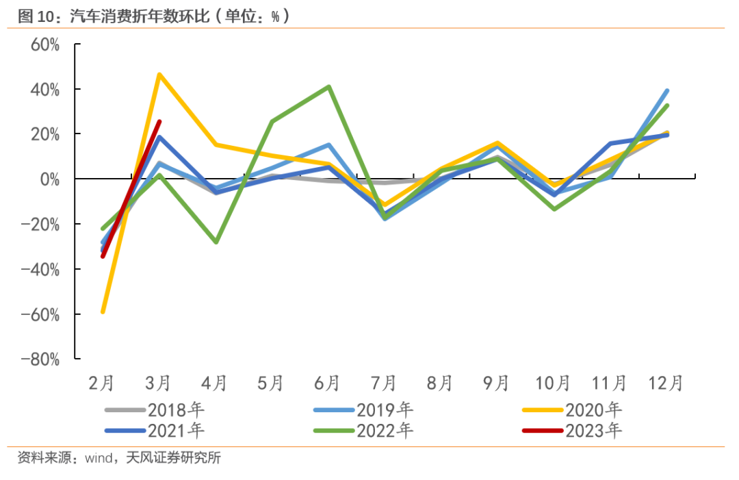 由于补贴政策对汽车消费的影响较大,去年财政补贴政策一定程度透支了今年居民汽车消费潜力。如果没有政策支持,今年汽车消费可能弱于其他可选消费的修复程度,具体走势还与后续补贴政策有关。