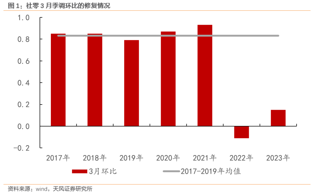 受益于疫后消费补偿性恢复,一季度社零同比增速从去年四季度的-2.7%上升至5.8%,但3月数据也显示,消费开始进入“高同比、低环比”的第二阶段 。如果不考虑低基数效应,仅看季调后的环比增速,今年3月社零环比只有0.15%,明显低于2017-2021年之间的任何一年,仅高于2022年3月,也明显低于今年2月0.67%的环比增速。