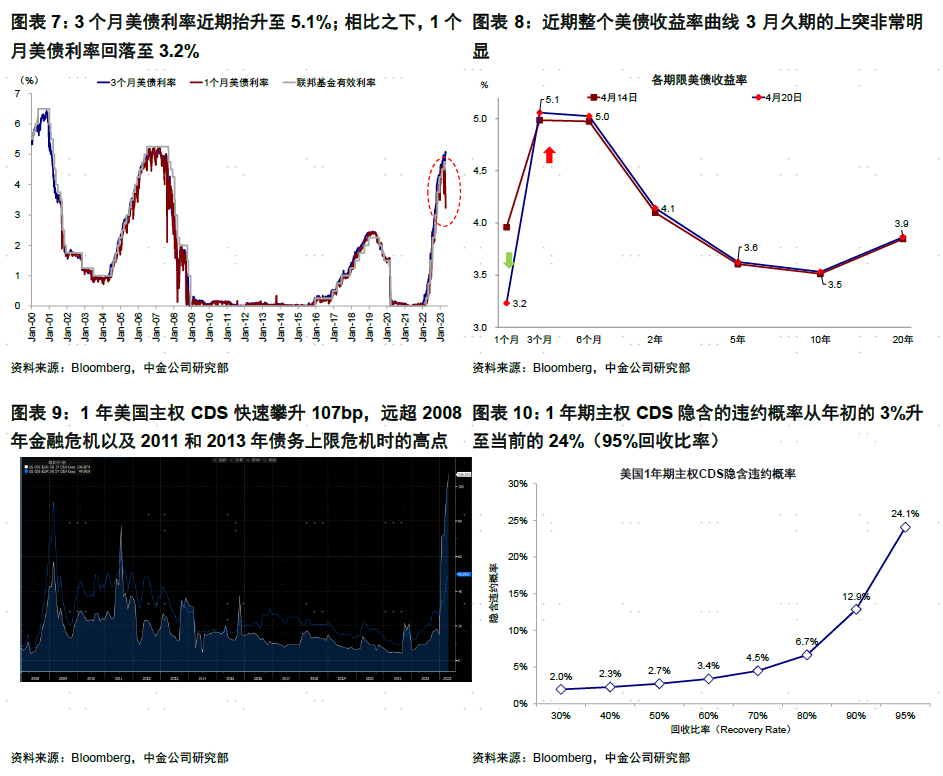 实际上,市场已经开始对此做出反应。例如,3个月美债因是最接近债务上限风险的期限,利率抬升幅度远超其他期限,近期已达到5.1%的2001年以来新高。相比之下,1个月美债利率因避险和置换需求反而回落至3.2%的去年10月以来新低,导致整个美债收益率曲线中3月久期的上突非常明显。此外,1年美国主权信用违约掉期(CDS)也快速攀升107bp,远超2008年金融危机(62bp)以及2011和2013年债务上限危机时的高点(80bp),隐含违约概率从年初的3%升至当前的24%。