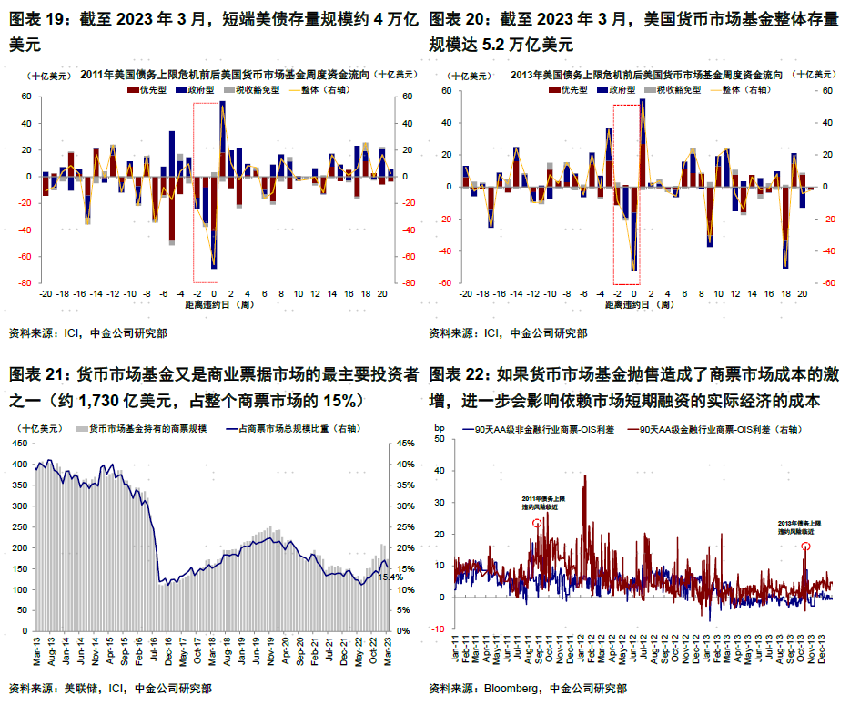 其传导链条为:1)避险情绪和资产损失可能加大货币市场基金的流出和赎回压力。回顾历史经验,2011和2013年违约风险临近均导致货币市场基金大幅流出(连续3周大幅流出,平均周度流出规模为427亿美元和268亿美元;年初至临近违约日的3周前平均周度净流出41亿美元和净流入7亿美元)。2)赎回压力可能加大货币市场基金的资产抛售压力,进一步加大流动性紧张。3)货币市场基金又是商业票据市场的最主要投资者之一(约1,730亿美元,占整个商票市场的15%),如果货币市场基金抛售造成了商票市场成本的激增,进一步会影响依赖市场短期融资的实际经济的成本,引发整体流动性风险的蔓延和外溢。