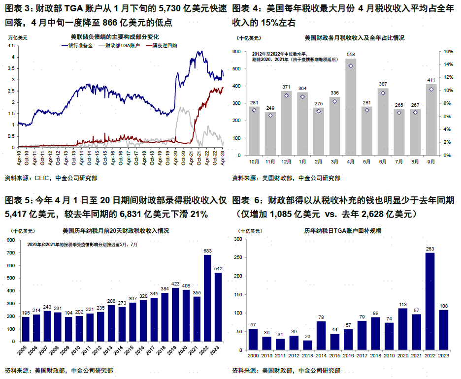 但4月税收不及预期或使得债务上限风险提前到来。此前,美国国会预算办公室估算财政部的非常规措施将在今年7~9月耗尽并面临真正风险。上述预测的一个关键变量取决于作为美国每年税收最大月份4月税收收入的多寡(平均占全年收入的15%左右)。由于今年截至4月中旬(美国纳税截止日)的税收明显偏少(今年4月1~20日财政部税收收入为5,417亿美元,较去年同期的6,831亿美元下滑21%),故财政部得以从补充的钱也明显少于去年同期(如截止日4月18日仅增加1,085亿美元vs. 去年2,628亿美元),这等于加大了资金提前耗尽的可能性,也会加快债务上限风险到来。