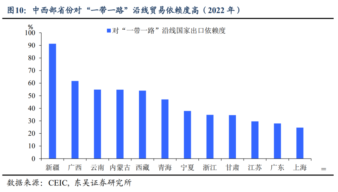 对外方面,“一带一路”沿线国家贸易对中西部和东北地区的拉动更加明显。从贸易流向来看,中西部省份出口主要流向“一带一路”沿线国家,且对“一带一路”沿线国家的外贸依赖度相当高,其中新疆2022年对“一带一路”国家的出口占总出口的91%左右,广西、云南、内蒙古、西藏也均超过总出口的50%。而东部沿海省份占比相对较低,上海、江苏、广东等省份都未超过总出口的30%,相反其出口更依赖于欧美日等发达国家。