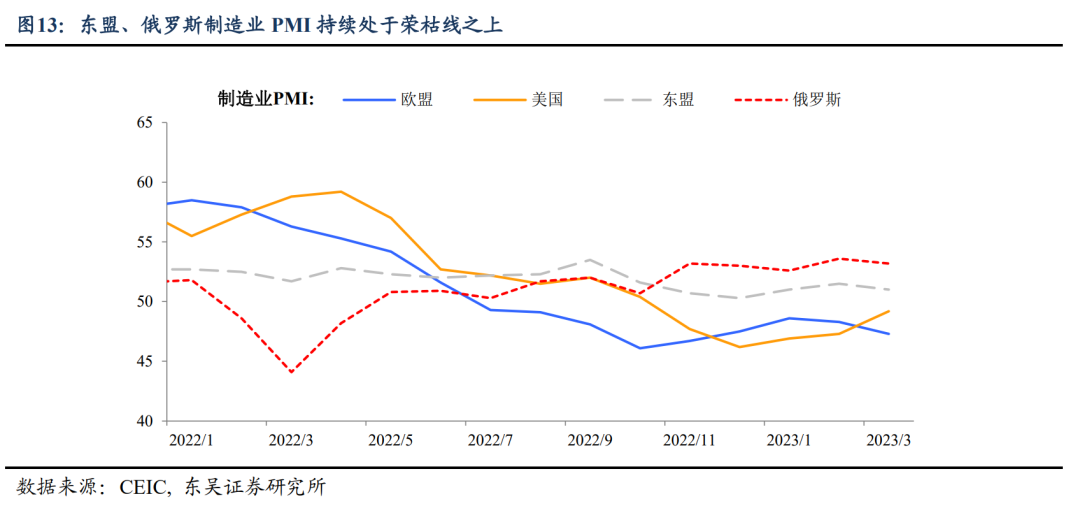 除了东西部出口增速分化、出口向“一带一路”国家转移外,产业结构的差异同样是出口超预期与地区调研差异的重要原因。中西部省份出口多流向“一带一路”沿线国家,2019-2022年间中西部省份出口增速恢复强劲,对整体出口增速具有较大贡献;相较而言,沿海省份更依赖于欧美等发达国家,但欧美随着衰退风险加大,需求疲软,因此东部省份出口增速偏弱。同时产业结构也是造成地区调研差异的重要因素,以东部沿海省份为例,相较广东、浙江、福建等地,江苏的产业结构更偏半导体和电子元器件,因而出口的边际改善更弱,而受“新三样”支撑更加明显的广东和福建,出口的表现相对更好。