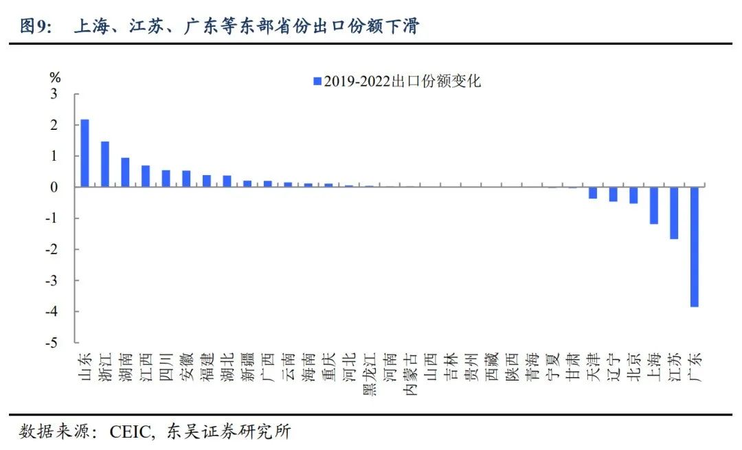 2023年年初更是延续这一特征,中西部省份和东部贸易大省出口增速明显背离,其中新疆、贵州第一季度同比增速均超过70%。出口份额上,疫情以来(2019年至2022年)上海(-1.19%)、江苏(-1.67%)、广东(-3.85%)等东部出口大省下降明显,逐渐向中西部省份倾斜。