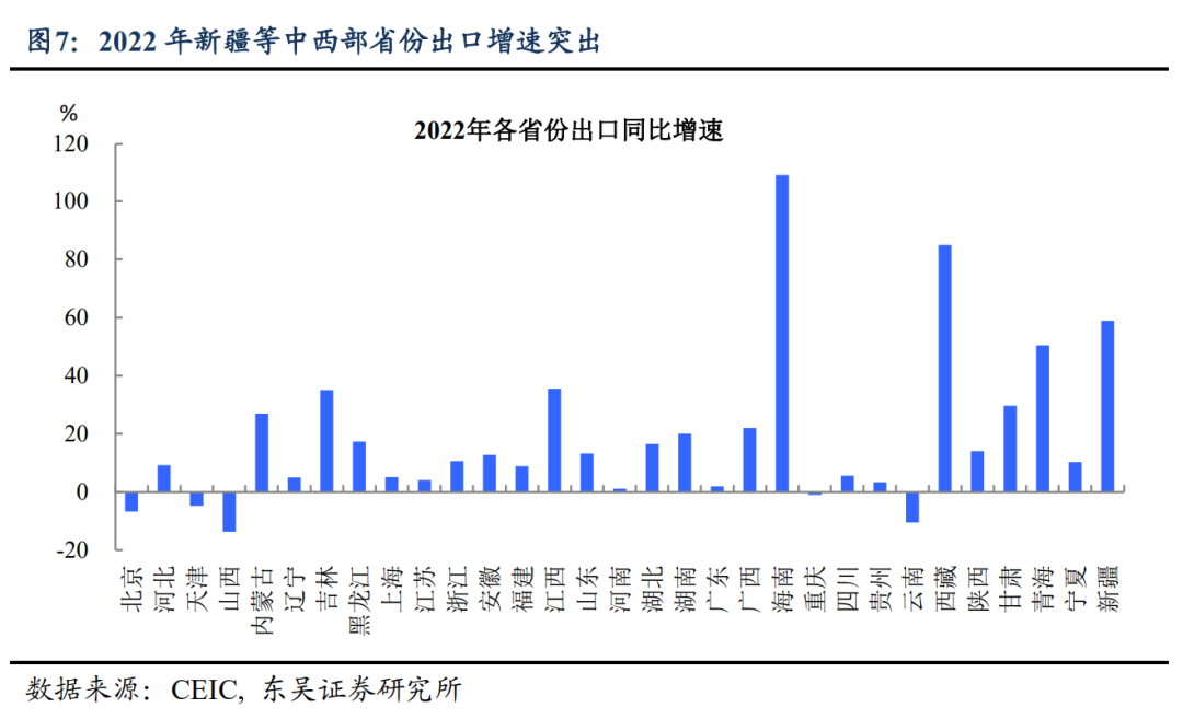 后者与贸易格局的变化密切相关,对内方面近年来国家重视引导加工贸易向中西部、东北地区进行梯度转移,新疆等中西部省份增速明显更快。2022年以来,随着欧美衰退风险加大,外需受到持续拖累。出口增速上,除海南受自贸港政策扶持保持高增速以外,沿海外贸大省如上海、江苏、浙江、广东出口增速均处于低位,而新疆、青海、甘肃、内蒙古等中西部省份出口增速均超过20%。