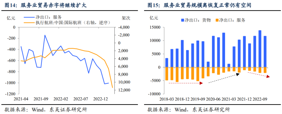 新的不确定因素,服务业需求复苏的“溢出效应”。除了以上“不确定性”外,2023年在净出口方面的另一大变数是随着跨境出行的不断升温,服务业贸易赤字规模的持续扩大。2023年以来我们看到国际航班执飞数量大幅反弹,与之相对应的是服务业贸易的赤字规模明显扩大。1、2月月均服务贸易赤字超过1000亿元,是2022年同期的2倍以上,根据我们测算若第二、三季度服务贸易赤字规模回到疫情前的水平(4000至5000亿元/季度),即使商品贸易盈余能和2022年同期持平(均为同期历史最高水平),净出口同比增速也会滑落至-20%以下,约拖累季度GDP0.6个百分点。