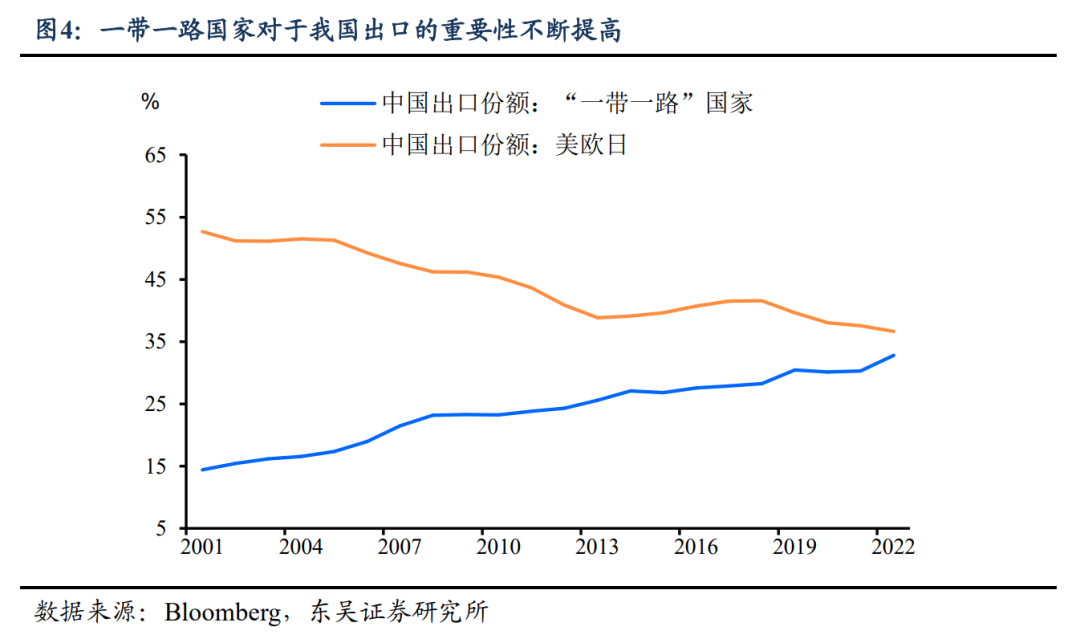 “海外”的变化主要在于我国出口产品相对“多而全”,一带一路国家“扛大旗”有关。这一点我们在此前的报告中已有阐述:一方面,韩国和越南的出口对于机电尤其是半导体、电子(例如手机)行业的依赖过重,受半导体下行周期的影响更大,而我国第一季度“新三样”(电动载人汽车、太阳能电池、锂电池)的出口则大幅加速、同比增长超过60%;另一方面,“一带一路”国家正在成为我国越来越重要的贸易伙伴。近年来,“一带一路”国家在中国出口中的占比持续上升,2013至2022年从25%上升到了32.9%,其中东盟上升幅度最大,而传统出口大户欧美日的贡献逐渐减弱(图3和4)。