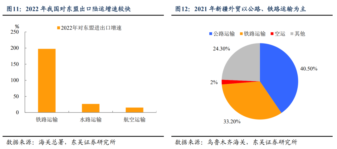 以上因素导致在运输方式上,陆运开始发挥越来越重要的作用。一方面,东盟、中亚、俄罗斯等地区毗邻我国,陆运兼具安全性和经济性;另一方面,中西部省份由于地理位置偏向内陆,陆路运输占比更大,且近年来增速较快。根据全国海关数据,2022年我国以铁路运输对东盟进出口增长197.6%、而同期水路、航空仅增长26.7%和15.5%。地方来看,以新疆为例,2021年以公路运输和铁路运输在新疆对外进出口中发挥主要作用,其中公路运输、铁路运输、航空运输同比上升63.7%、1.3%、15.7%,占比分别达到40.5%、33.2%、2%。2022年新疆进出口货运量同比增加10.5%,其中以铁路、公路运输方式分别增加16%、170.7%。