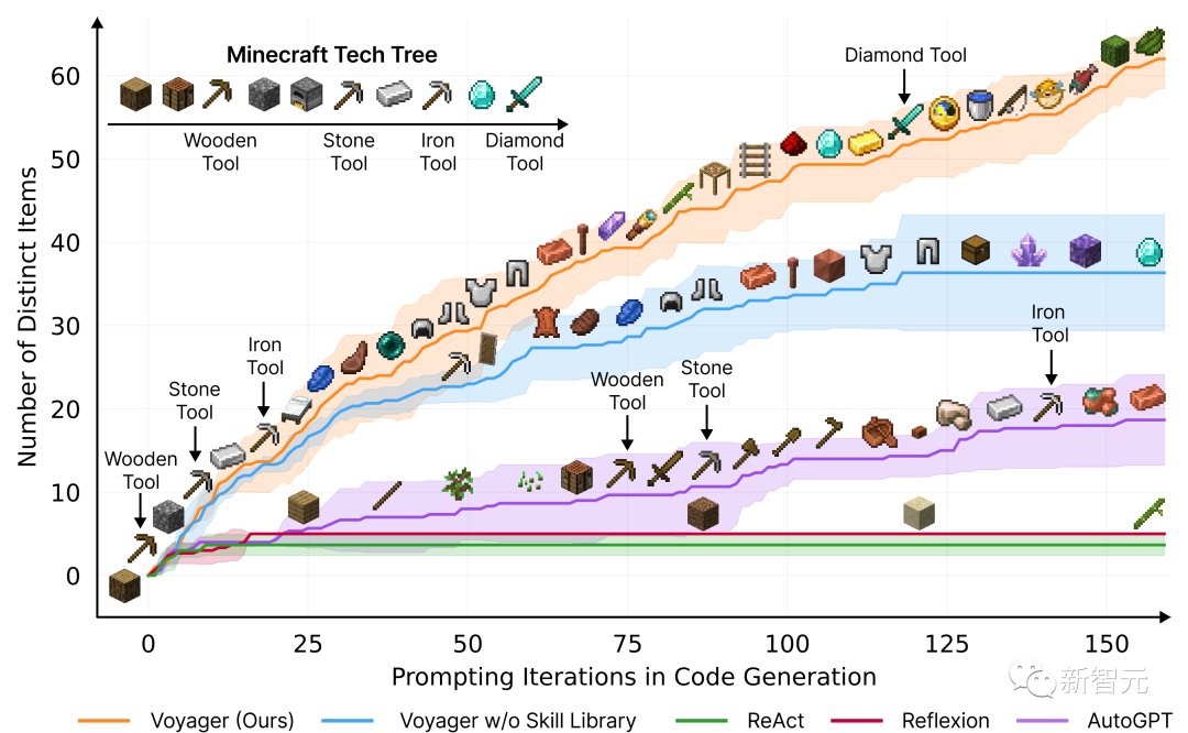 在发现新物品、解锁Minecraft技术树、穿越多样化地形,以及将其学习到的技能库应用于新生成世界中的未知任务方面,Voyager表现出了优越的性能。