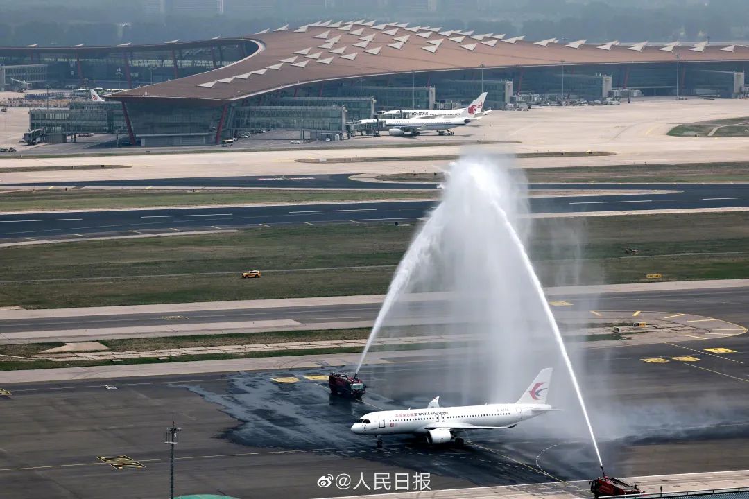 北京时间12点31分,中国东方航空MU9191航班顺利抵达北京首都国际机场,之后穿过了象征民航最高礼仪的“水门”。国产大型客机C919全球首次商业载客飞行成功。