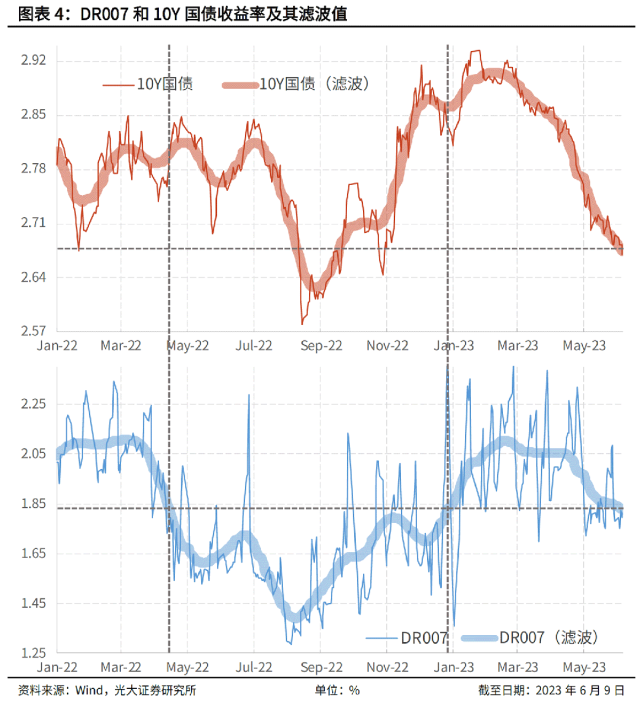在《债券投资者不必过度关注存款利率——2023年4月9日利率债观察》中我们曾论证过存款利率并非债券市场估值的锚。前一阶段债券收益率下行主要是因为资金宽松等原因,而非存款利率降息。