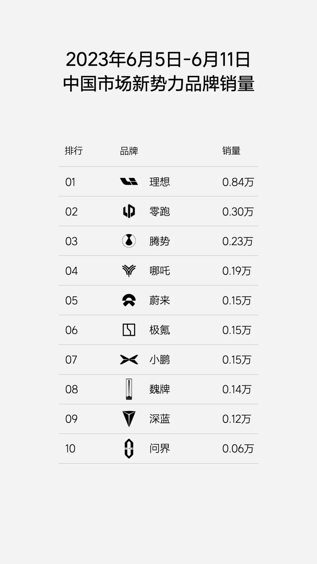 6月13日,理想汽车官方微信公众号发文称,在刚刚过去的2023年第24周(6.05-6.11),理想汽车的周销量再创新高,达到了0.84万辆,远超其他新势力品牌,也超过了榜单中第二、三、四名的销量总和。截至6月11日,理想汽车本月销量已达1.19万辆。