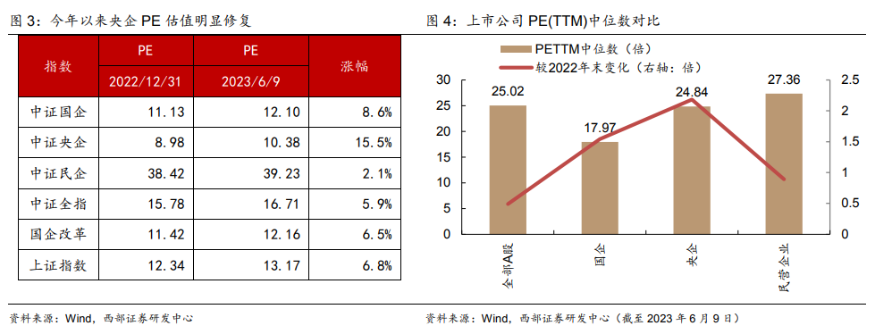 西部证券表示,今年以来央企与国企相对民企A股估值已有不同程度的修复,1347家上市公司中央企、国企、民企PE(TTM)中位数分别为24.84、17.97、27.36倍,较2022年末分别上升2.18、1.54、0.89倍。