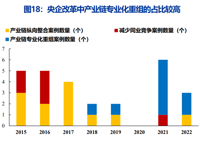 其表示,2021年起新一轮央企改革将重点转向“产业链专业化重组”,6起央企合并事件中有5起为专业化重组,改革逻辑转变明显、央企改革加速,代表案例有中国铝业、中国五矿等。2022年,央企间大部分的重组、整合签约都围绕产业链的构建和完善。例如,宝武与中钢的合并意在整合中钢在产业链上游矿产开发、工程装备、新材料等领域的优势。